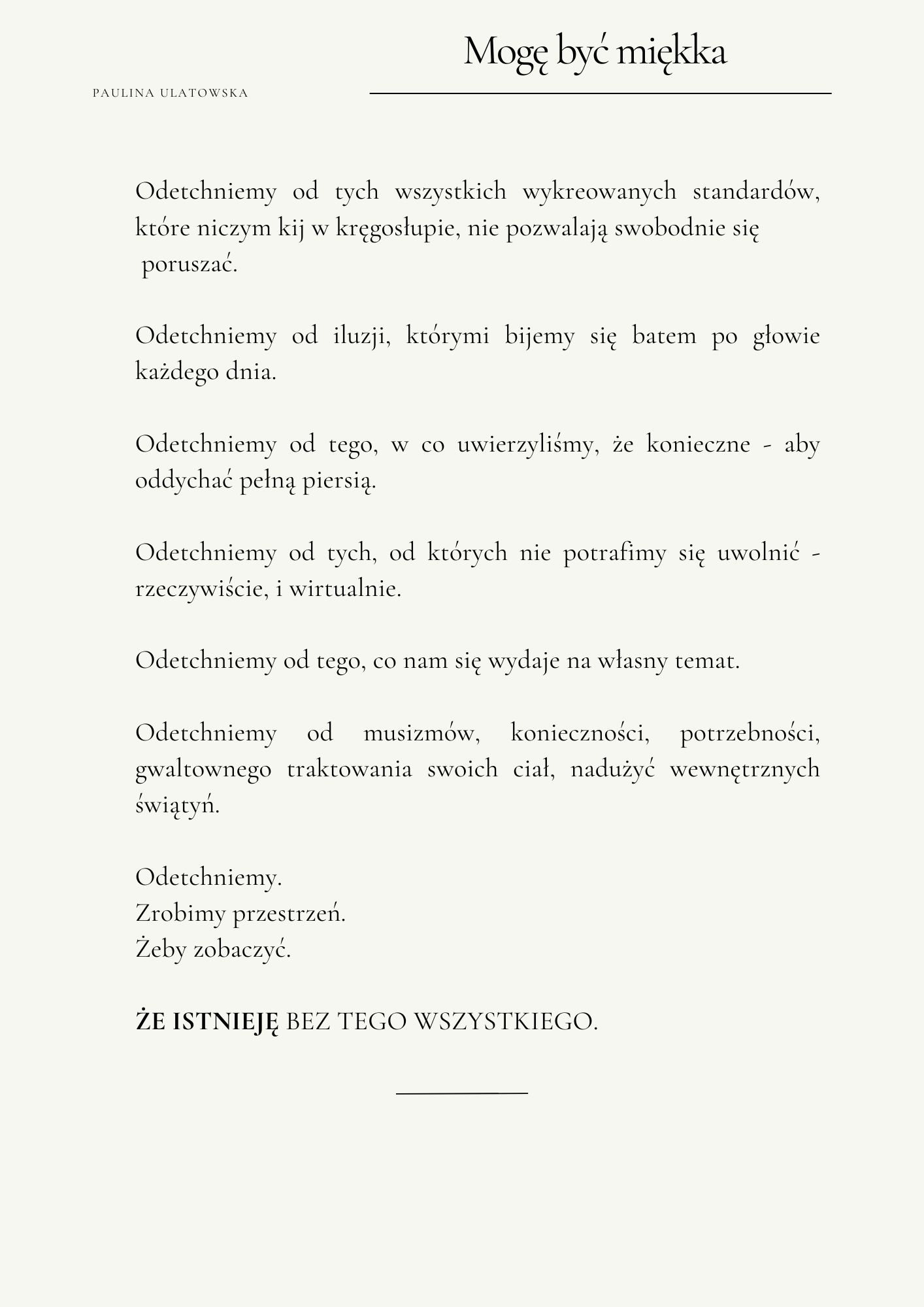 Hołduję i kłaniam się każdej kobiecie, która ma odwagę porzucić iluzje umysłu i z zaufaniem zejść do swojego ciała. O tym jest niniejszy E-book. O tym, w jaki sposób traktować siebie i swoje ciało, jak pozostać w miękkości w tak pozornie niestabilnym świecie, a także o relacji ze swoim układem nerwowym.